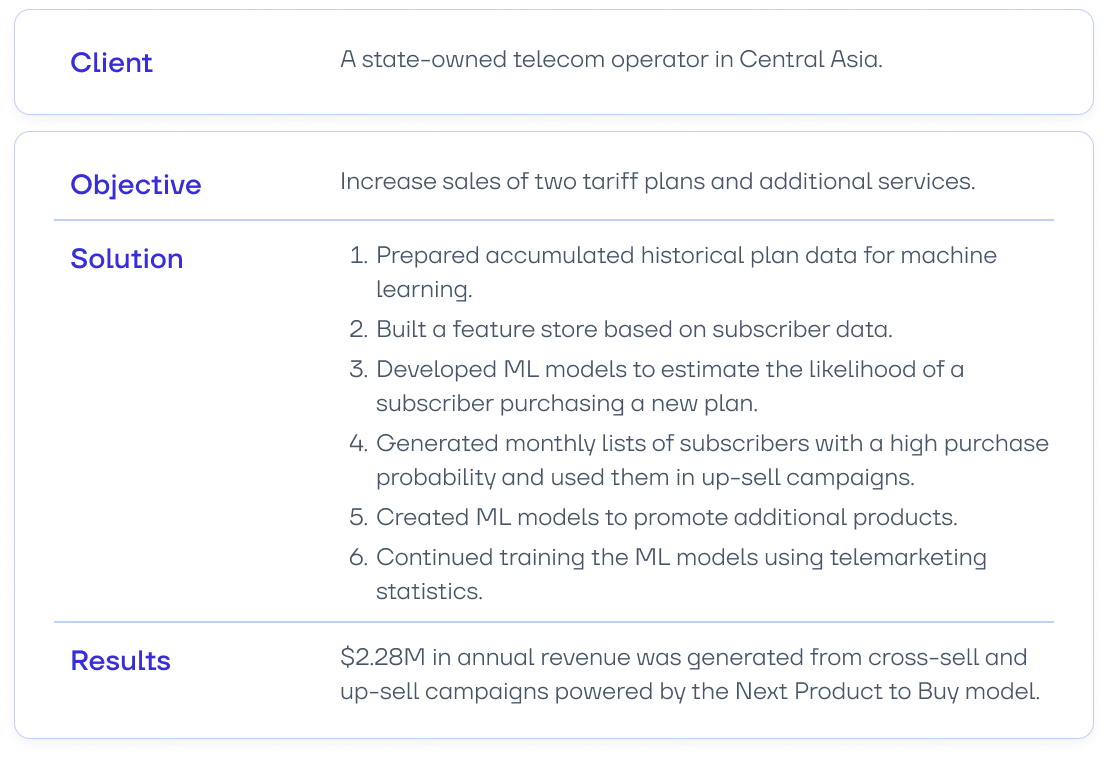 The telecom operator wanted to boost revenue by promoting higher-tier plans and additional services. They had accumulated historical data, but to unlock its value, machine learning was needed. We helped the client develop ML models to improve the conversion of up-sell and cross-sell campaigns. As a result, they gained an extra $2.28M in sales. Read the full story in our case study.