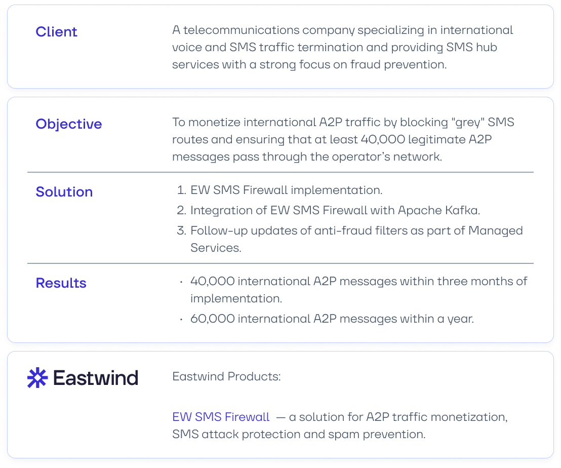 To reach the expected revenue from A2P traffic monetization as quickly as possible, the client not only deployed the EW SMS Firewall platform but also signed a Managed Services contract. This collaboration model ensures full support for EW SMS Firewall with Eastwind specialists continuously monitoring newly emerging fraud schemes and updating filters. This proactive approach is crucial, as fraudulent aggregators constantly develop new ways to bypass message delivery restrictions. Keeping filters updated is key to maintaining optimal performance. Additionally, our partner set a KPI of 40,000 international A2P SMS per day to secure the necessary revenue level.