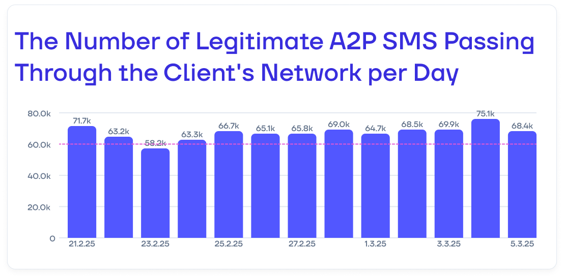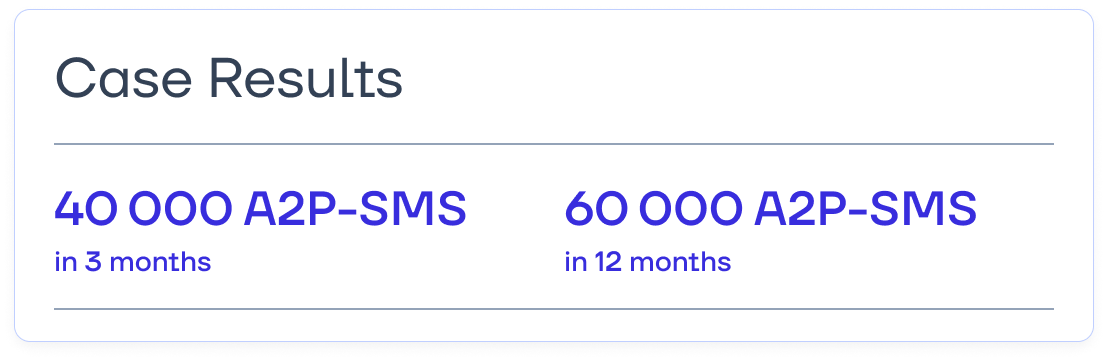 3 months after the project completion, the client successfully met its traffic volume target—40 000 SMS per day. Today, the results exceed expectations. The client is now handling 60 000 legitimate A2P messages daily, generating even higher revenue than originally planned.