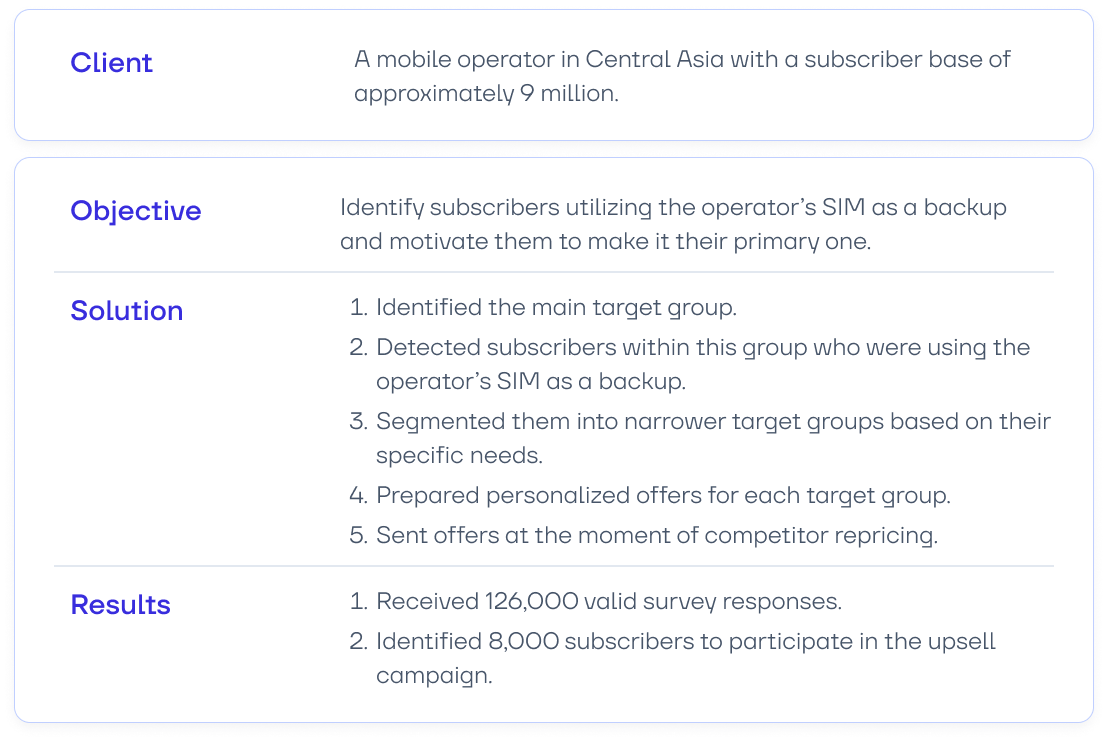 When subscribers use multiple SIMs, one typically serves for daily communication, while the other is reserved for specific purposes like roaming, international calls, or mobile data. Our client aimed to encourage more active usage of their network among dual-SIM phone users—without triggering churn.