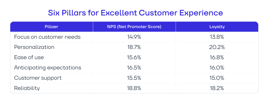 The survey revealed six core pillars that define strong customer experience. They are summarized in the table below.