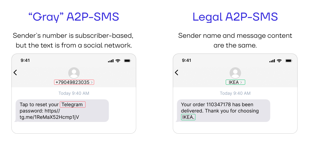 – Masking international SMS as local messages. International traffic is significantly more expensive than local traffic. To profit from this difference, aggregators manipulate MSISDNs and route messages through local operators’ networks, bypassing official SMS exchange agreements between domestic operators. The price difference is pocketed by the aggregators.