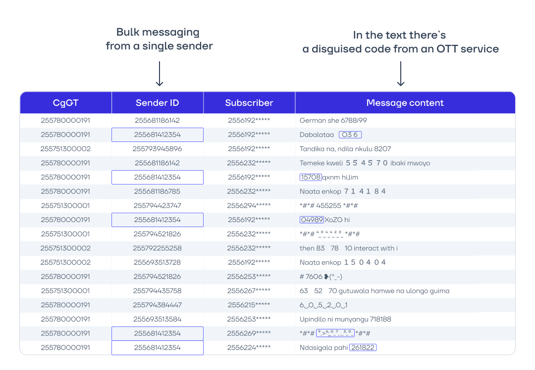 – Sender numbers don’t match the SMS content. The aggregator sends messages from international OTT services using subscriber SIM cards with national MSISDNs. This is an example of SIM box fraud in telecom.