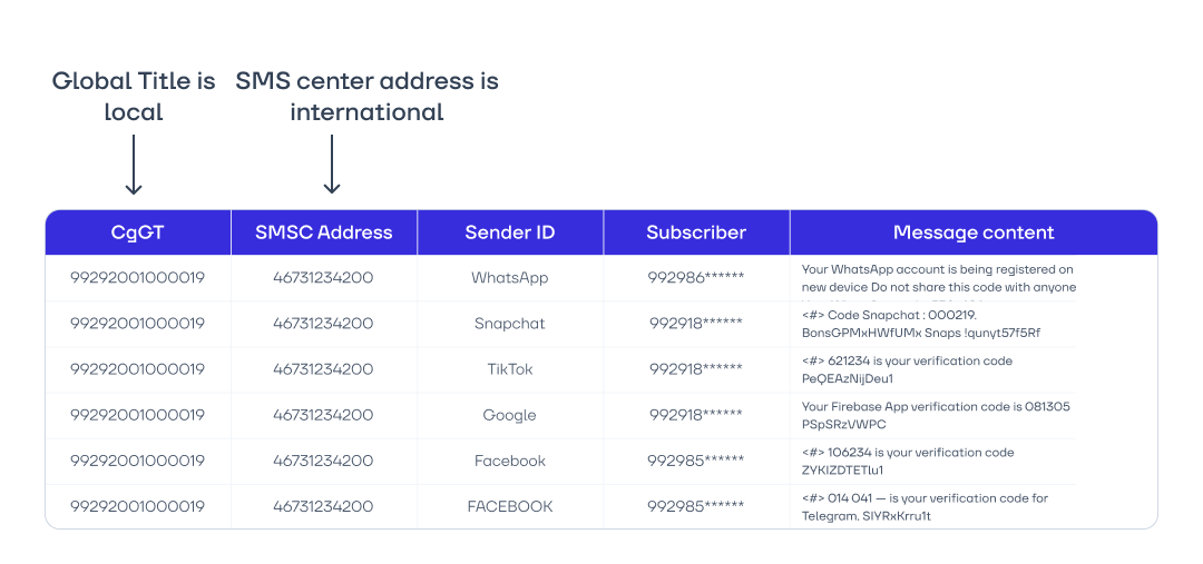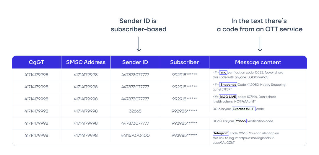 Sender numbers don’t match the SMS content. The aggregator sends messages from international OTT services using subscriber SIM cards with national MSISDNs. This is an example of SIM box fraud in telecom.