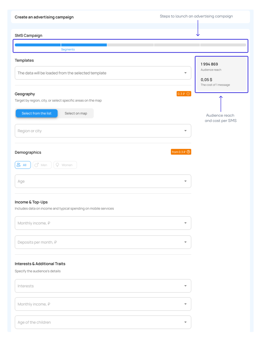 Advertisers can send campaigns to the operator’s subscriber base or to their own. In the latter case, targeting will apply only to users who are customers of that specific operator. Messages will not be sent to subscribers of other telecom companies. Each operator decides which subscriber profile parameters to make available for targeting in the B2B platform. These can include: