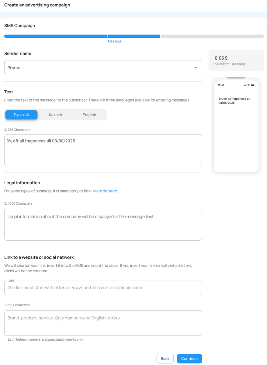 During the campaign setup, advertisers can preview how the message will be displayed on a mobile phone screen.