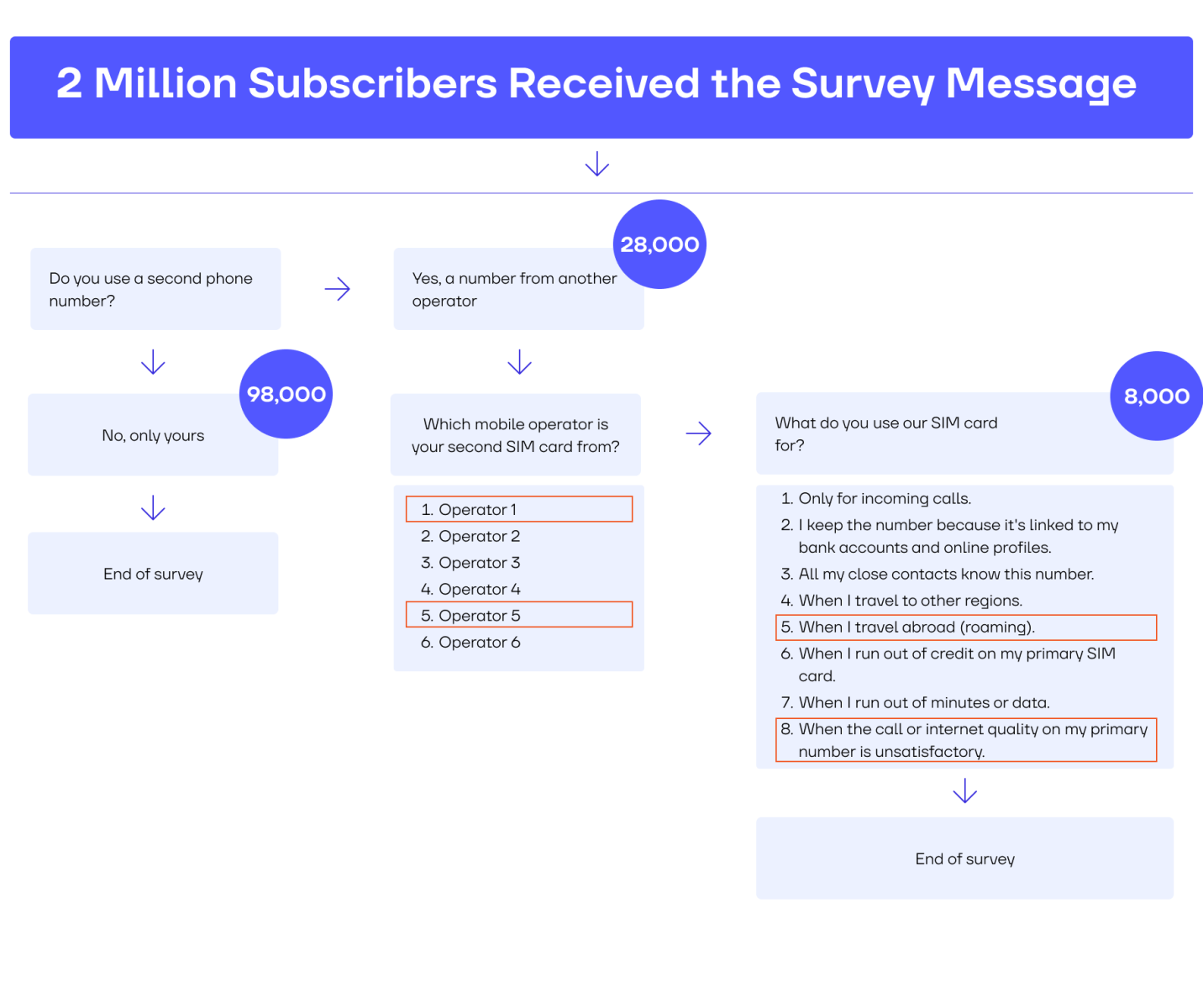 A total of 126,000 subscribers responded to the survey, with 8,000 acknowledging that they used the client’s SIM as a backup. Among competitors, subscribers most frequently mentioned two mobile operators, receiving 2,800 and 1,400 responses, respectively.