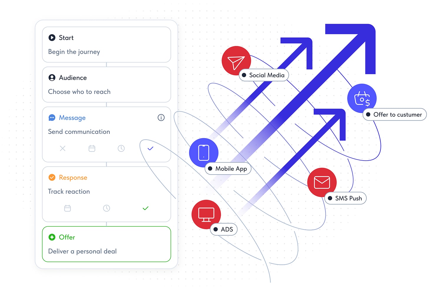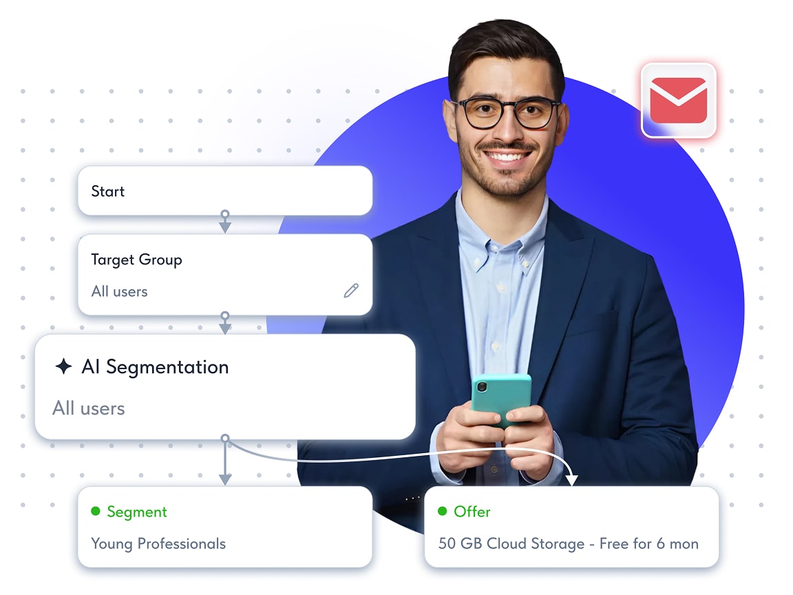Scale your marketing with NBO functionality and an offer store that automatically selects relevant products and personalizes messages. A single campaign can include thousands of individual customer journeys—with no manual setup required.