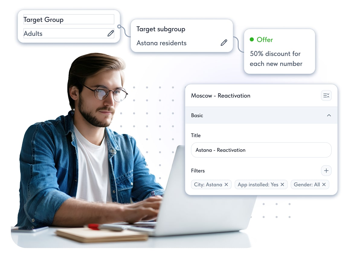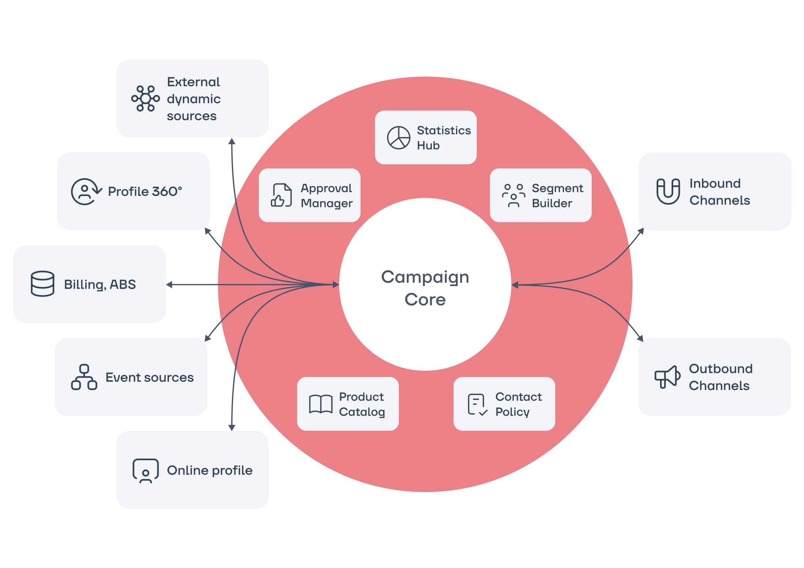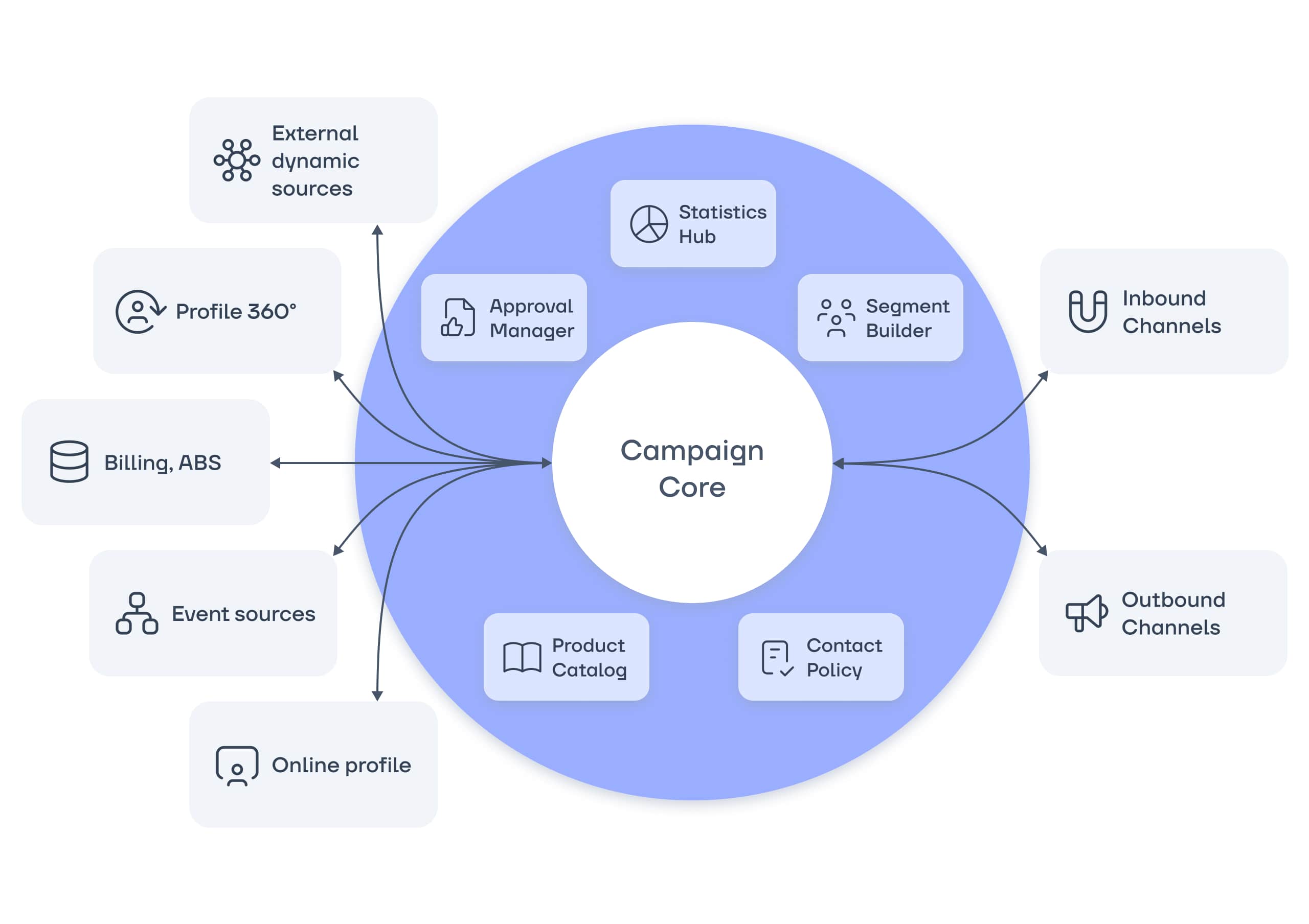 The campaign management system integrates with both traditional and digital channels: SMS, USSD, push notifications, in-app stories and banners, chatbots, and AI-powered voice assistants.