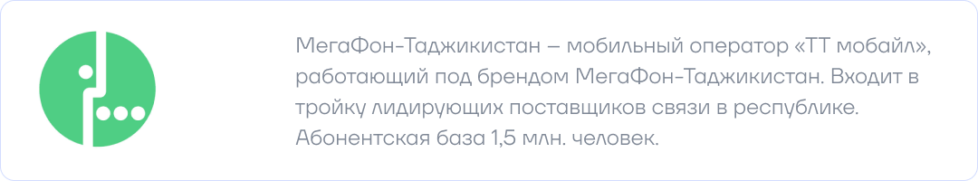 Абонентская база МегаФон-Таджикистан — 1,5 млн. человек. Часть этой аудитории — родственники трудовых мигрантов. Оставаться на связи обеим сторонам позволил вовремя выведенный на рынок интегрированный в сеть GSM мессенджер MegaFon Life, сконструированный на базе платформы цифровых сервисов Polyphone от компании Eastwind.