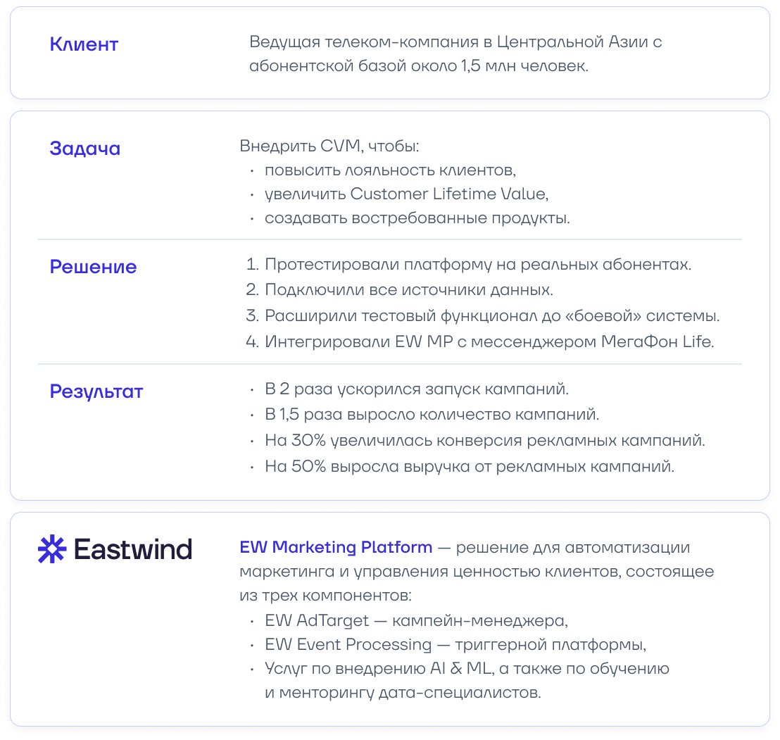 В ходе пилота специалисты Eastwind успешно реализовали два кейса: формирование профиля абонента и повышение конверсии в кампаниях.