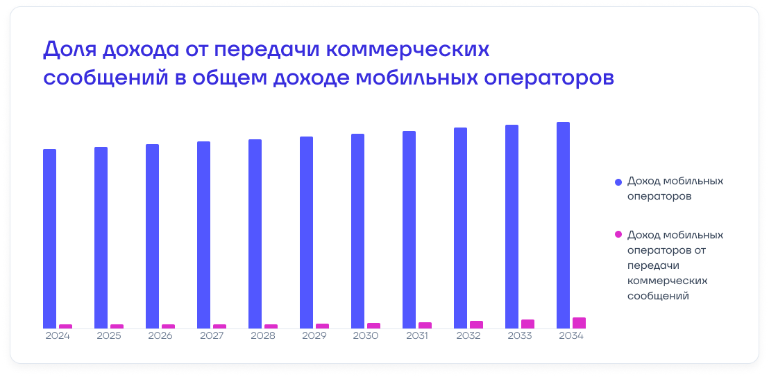 Доля дохода от доставки коммерческих SMS в общей выручке мобильных операторов растет и к 2034 году составит 3,44%