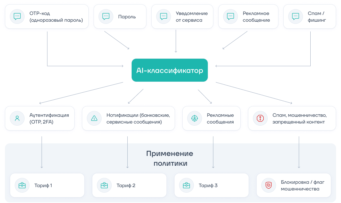 Сегментация по тарифам. AI-классификатор в составе антифрод-модуля сегментирует A2P-трафик по типам сообщений — например, банковские уведомления, сервисные сообщения, маркетинговые рассылки. Для каждого типа можно задать отдельный тариф, чтобы гибко управлять доходами.