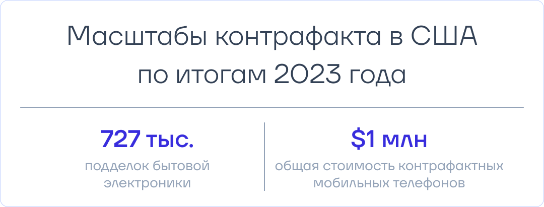 Из общего объема мировой торговли контрафактные товары составили 2,3% по итогам 2021 года. На территории Европейского Союза в 2023 году изъяли 152 млн единиц нелегальной продукции на сумму свыше €3,4 млрд — по сравнению с 2022 годом рост составил 68%. Причем электроника, в том числе телефоны, традиционно входит в топ поддельных товаров наряду с одеждой, обувью и изделиями из кожи.