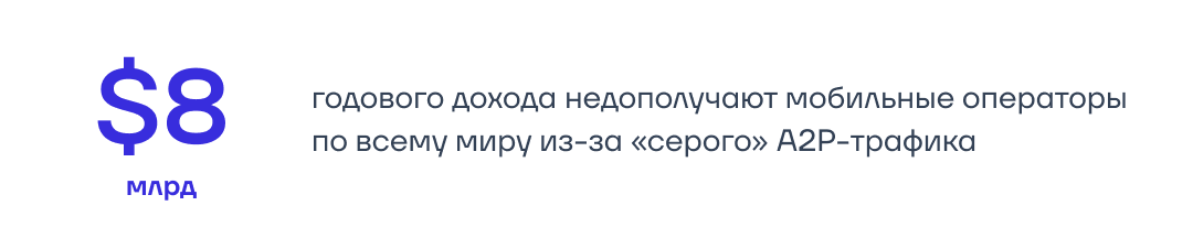 Мобильные операторы упускают потенциальный доход из-за недобросовестных SMS-агрегаторов и контент-провайдеров, которые хотят сэкономить на терминации A2P-трафика. Они отправляют SMS по нелегальным маршрутам, чтобы снизить себестоимость каждого сообщения и увеличить свой заработок. Из-за этого операторы недополучают положенный доход. Так, по данным GSMA, 45% всего A2P-трафика проходит в обход легальных маршрутов.