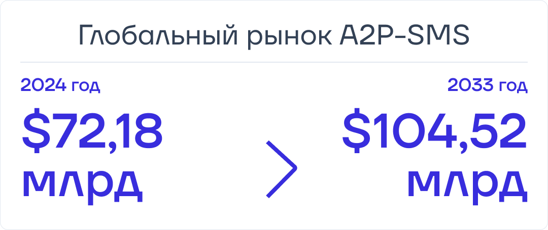 Весь объем рынка коммерческих A2P-сообщений по итогам 2024 года оценивается в 72,18 млрд долларов. По прогнозам, к 2033 году он вырастет до 104,52 млрд долларов. Для операторов это возможность увеличить прибыль за счет монетизации трафика, при условии если они не будут пропускать «серый» трафик в свою сеть.