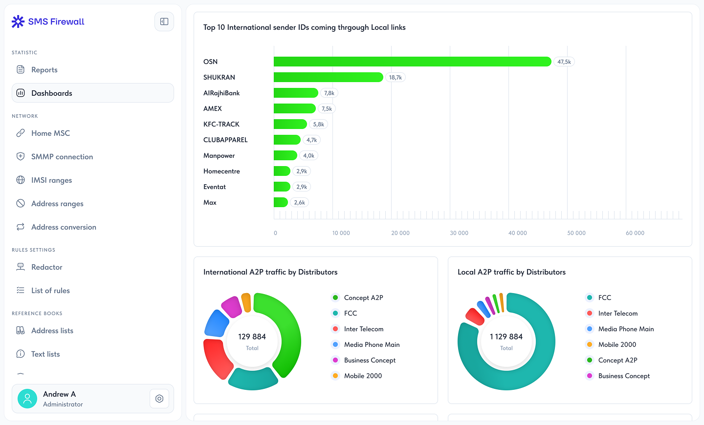 В отчете EW SMS Firewall видно, какой объем международного и локального A2P-трафика прошел через сети мобильного оператора