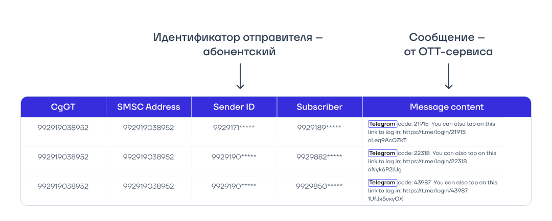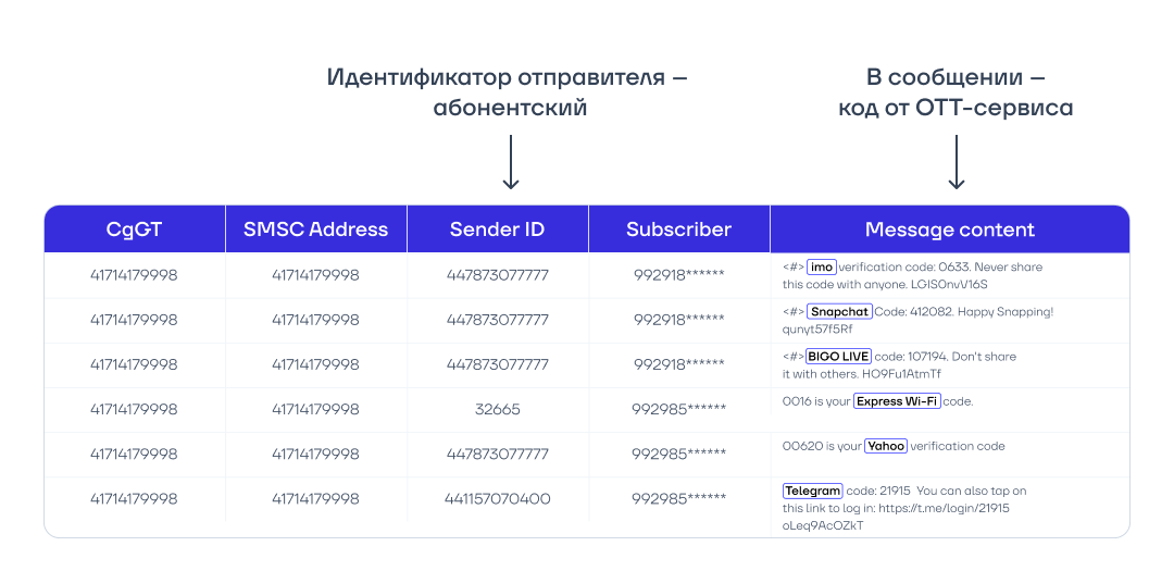 — Номера отправителя не соответствуют тексту SMS. Агрегатор отправляет сообщения от международных ОТТ-сервисов с помощью абонентских SIM-карт с национальными MSISDN, то есть использует SIM-банки.