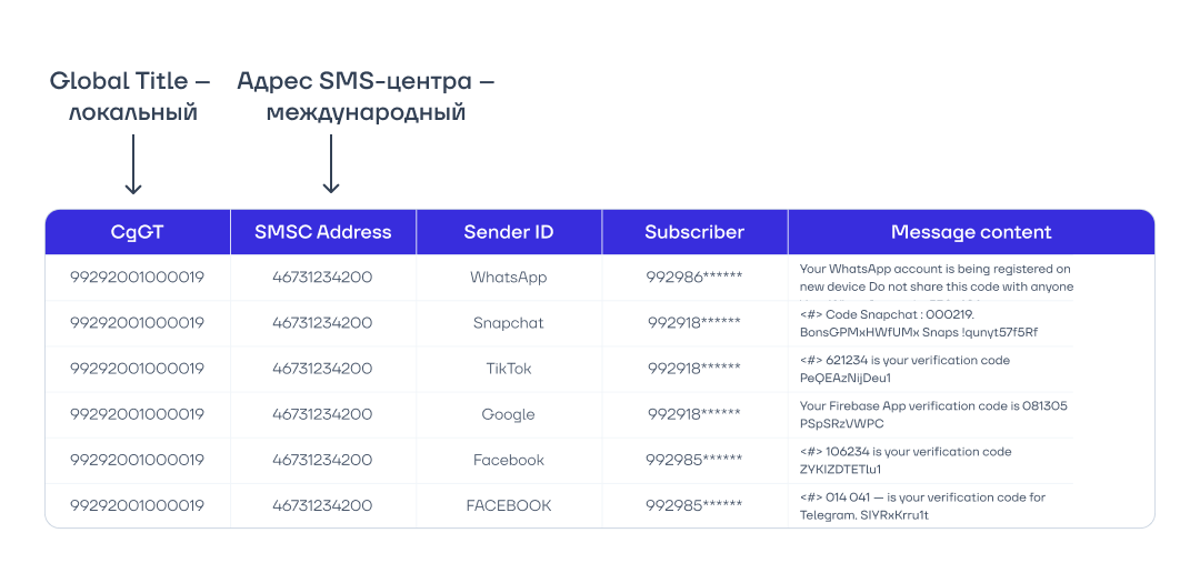 — Адрес SMS-центра не совпадает с Global Title оператора. SMS-агрегаторы отправляют международные A2P-сообщения через сеть локального оператора в обход соглашений об SMS-обмене между операторами внутри страны.
