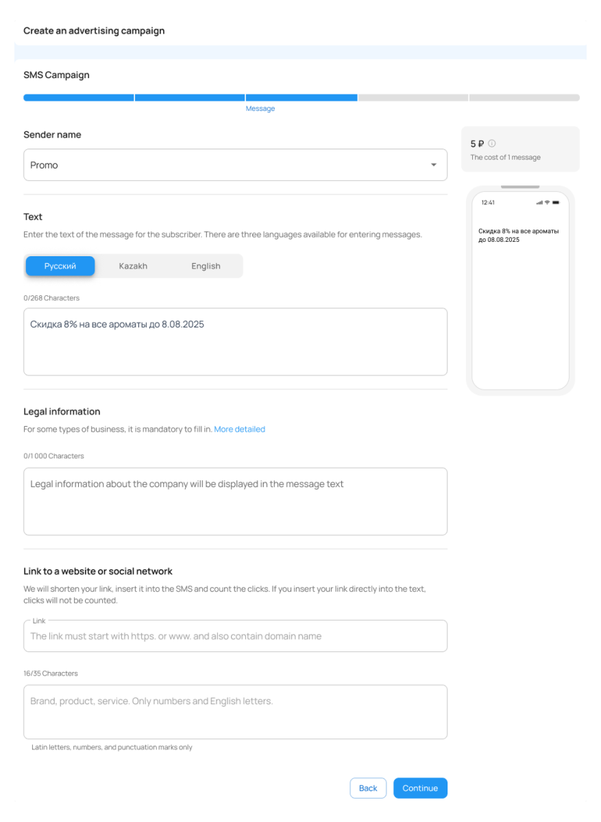 На этапе создания рассылки рекламодатель может оценить, как будет выглядеть текст сообщения на экране телефона