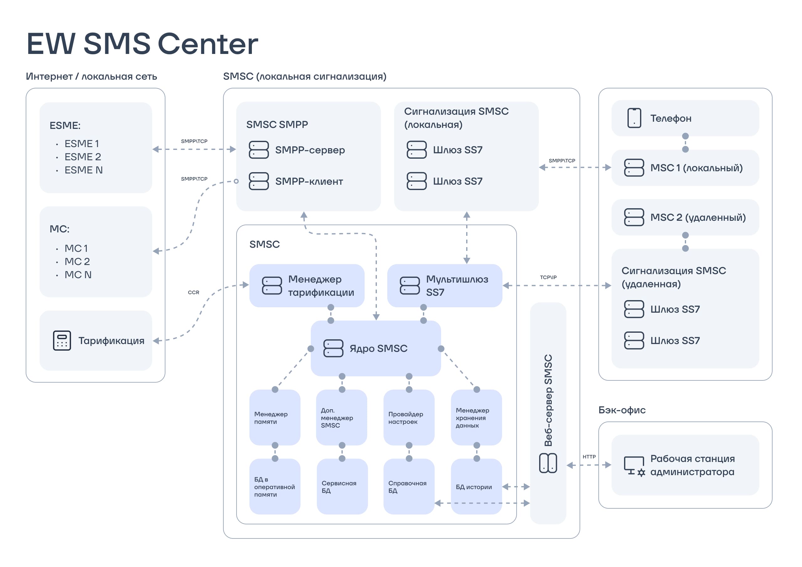 EW SMS Center работает на основе Oraсle Linux и RedHat Enterprise Linux. Базы данных функционируют под управлением СУБД Redis, PostgreSQL, ClickHouse.